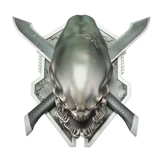 Depicting a bullet-scarred Elite skull on crossed combat knives, this wall mount measures